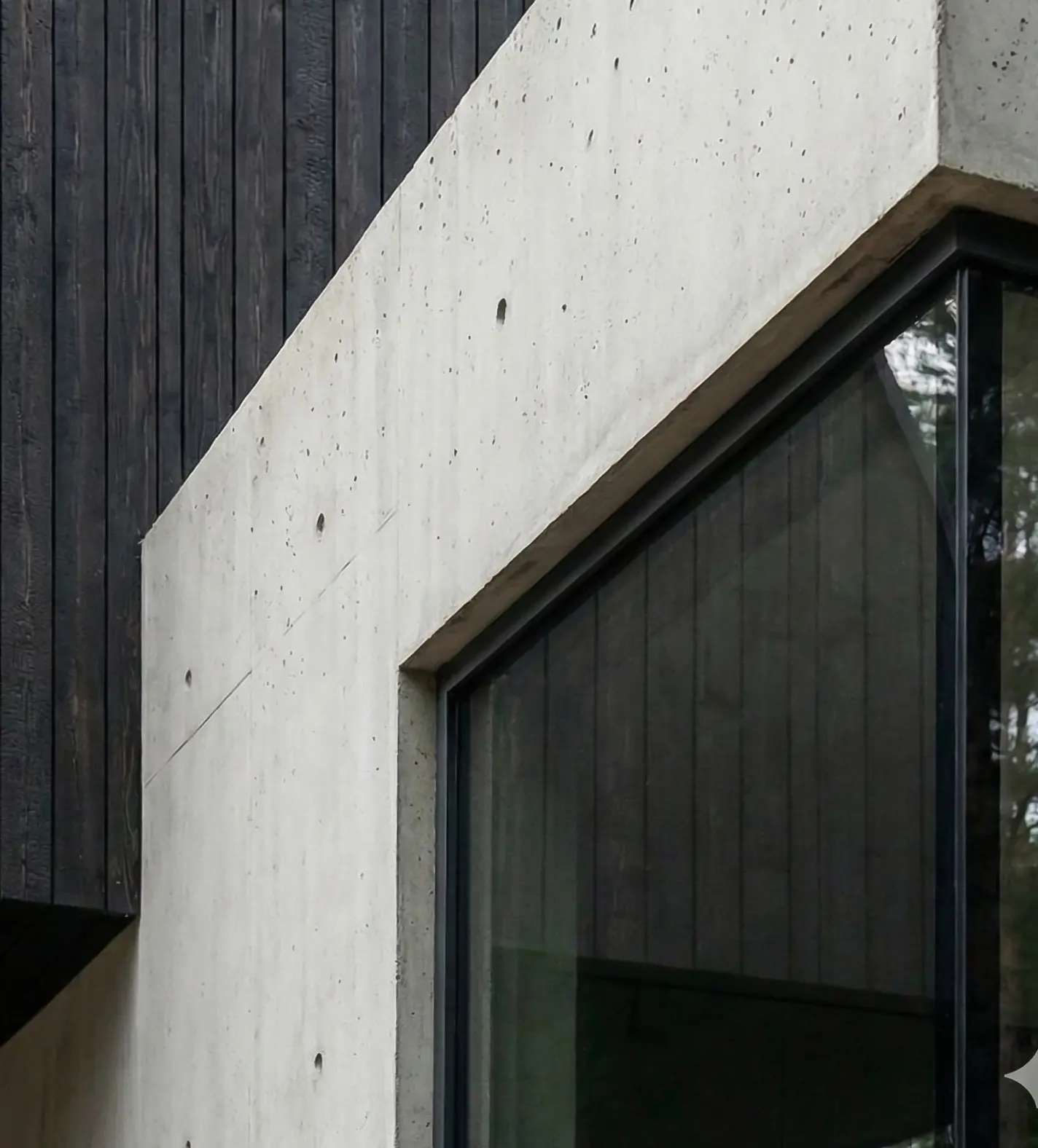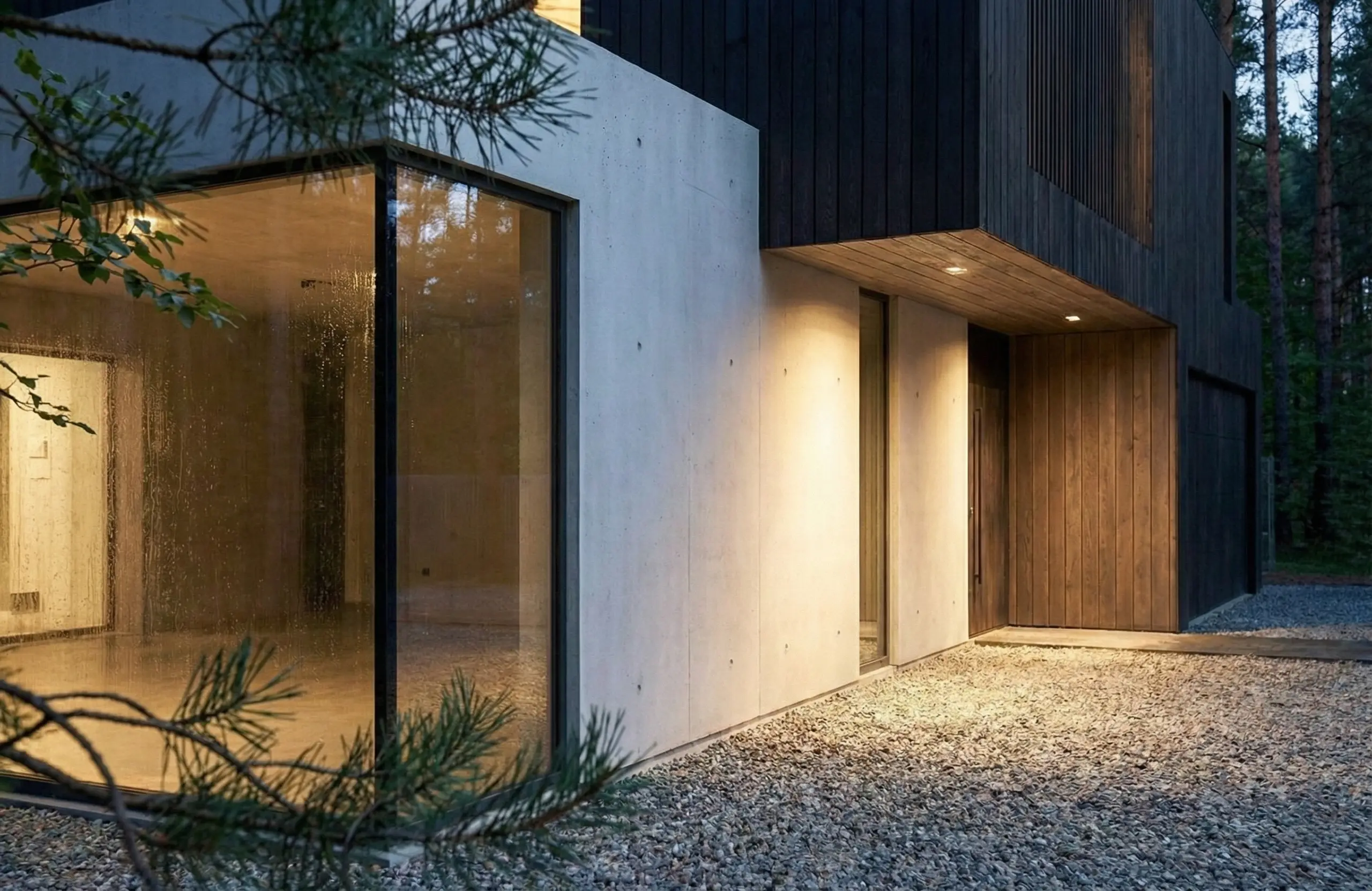 Nasza realizacja to przykład indywidualnego projektu domu, który łączy monumentalną bryłę z lekkością przeszklonych fasad. Jako doświadczeni architekci postawiliśmy na surowe materiały – beton architektoniczny i naturalne drewno – które idealnie wpisują budynek w leśny krajobraz. Ta nowoczesna willa została zaprojektowana z myślą o maksymalnej prywatności domowników, przy jednoczesnym otwarciu strefy dziennej na ogród.
